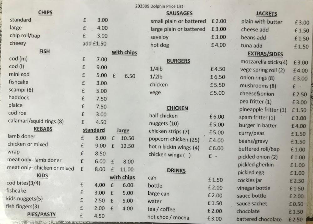 Located in picturesque Hayling Island, Dolphin Fish Bar stands as a testament to the quintessential British fish and chip experience. The area brims with seaside charm, where golden sands meet local attractions, making it a perfect destination for families and visitors alike. This casual eatery is easy to spot and invites you in with its bright signage—though the interior may need a little TLC to match the quality of its offerings. It serves lunch and dinner, catering especially well to solo diners and groups alike. The surrounding area offers free street parking, making it convenient to grab a bite to eat before or after a day of exploring the local coastline and parks. The Dolphin Fish Bar's commitment to tasty, freshly cooked meals shines in its friendly service and bustling vibe, attracting a diverse clientele from families with kids to hungry tourists. This community-driven spot continues to earn a loyal following thanks to its delicious, quality food.